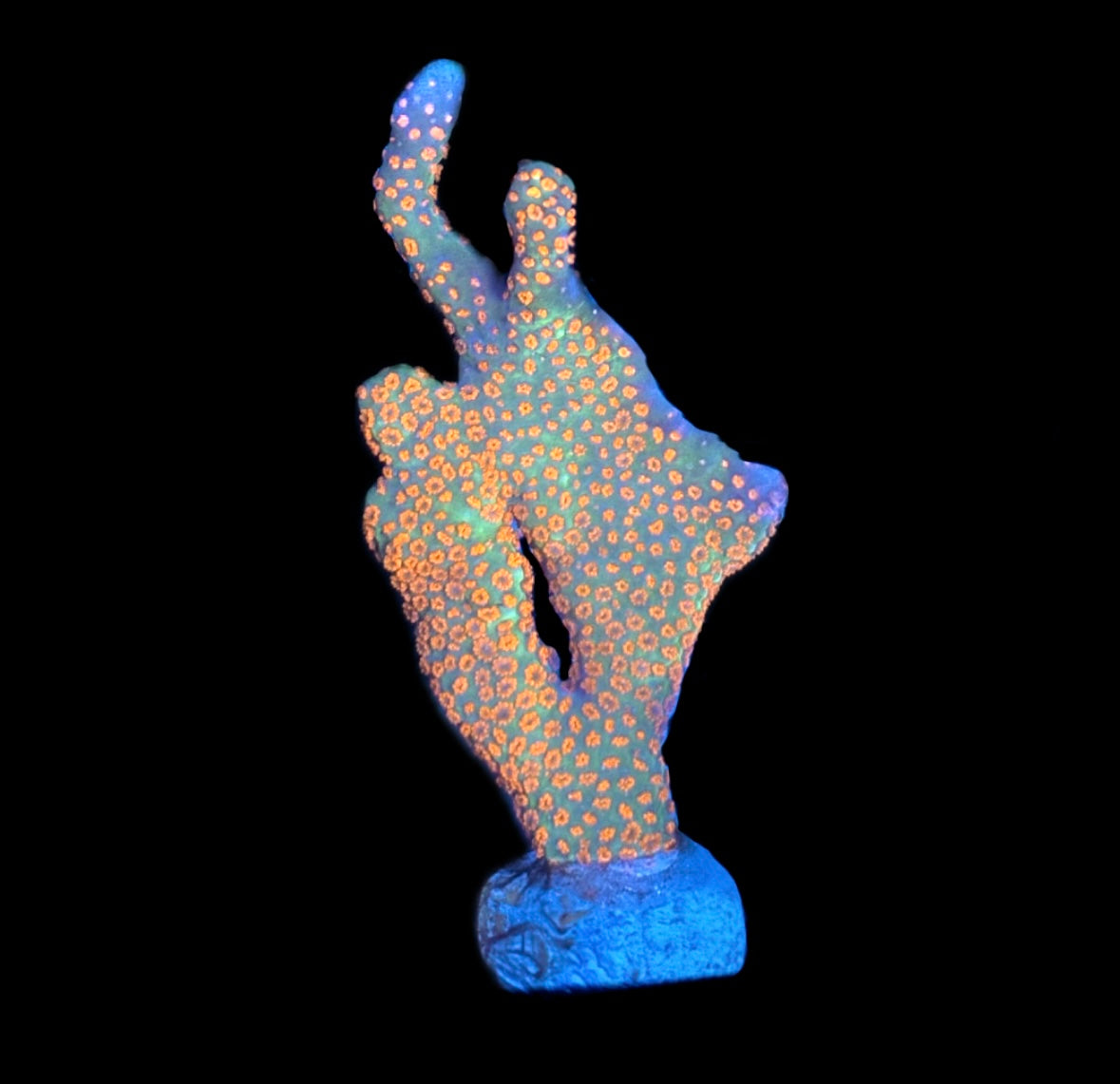 Perfect green base with neon orange polyps! This coral is a great started SPS coral that will add a pop of color to any aquarium!