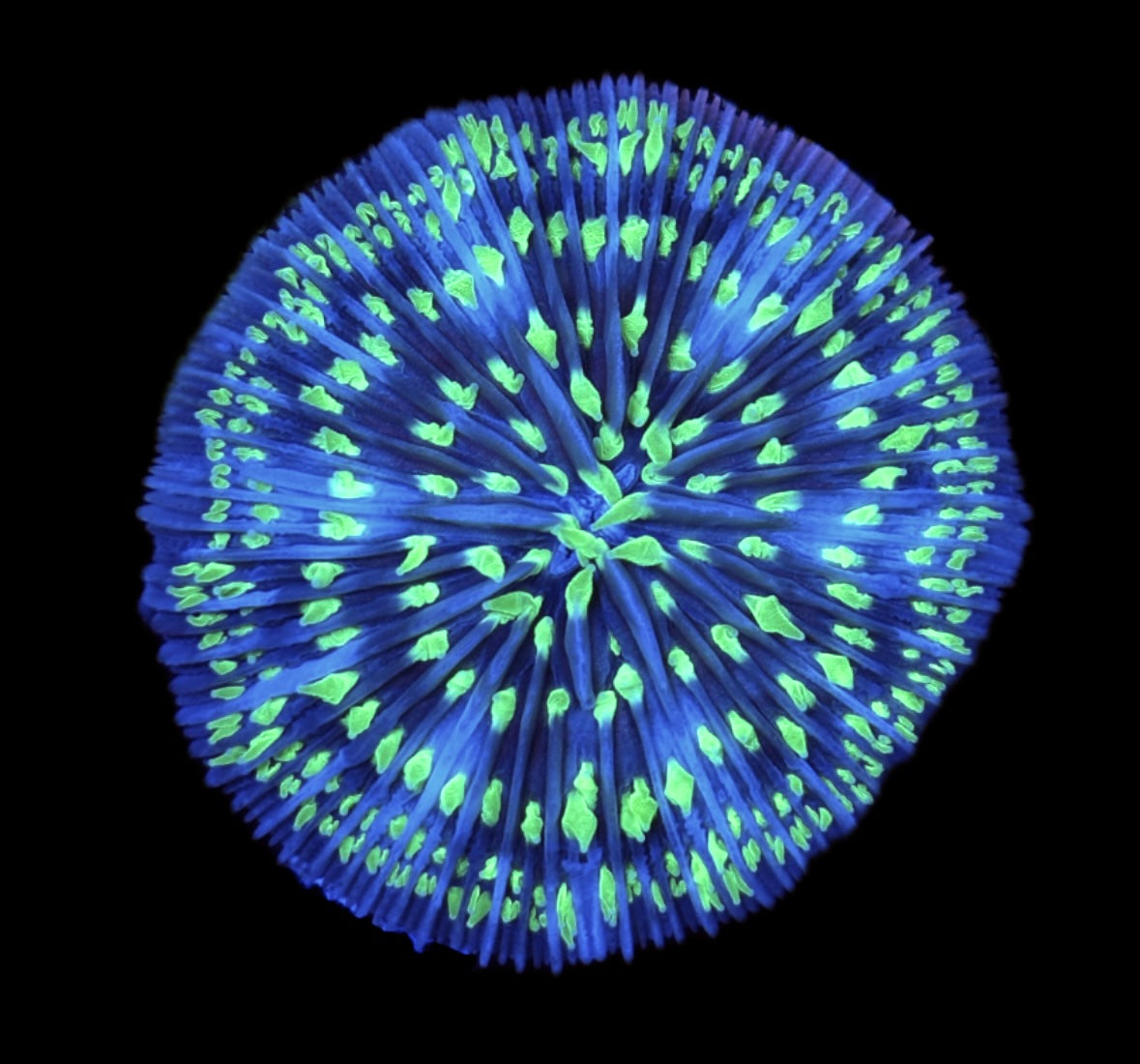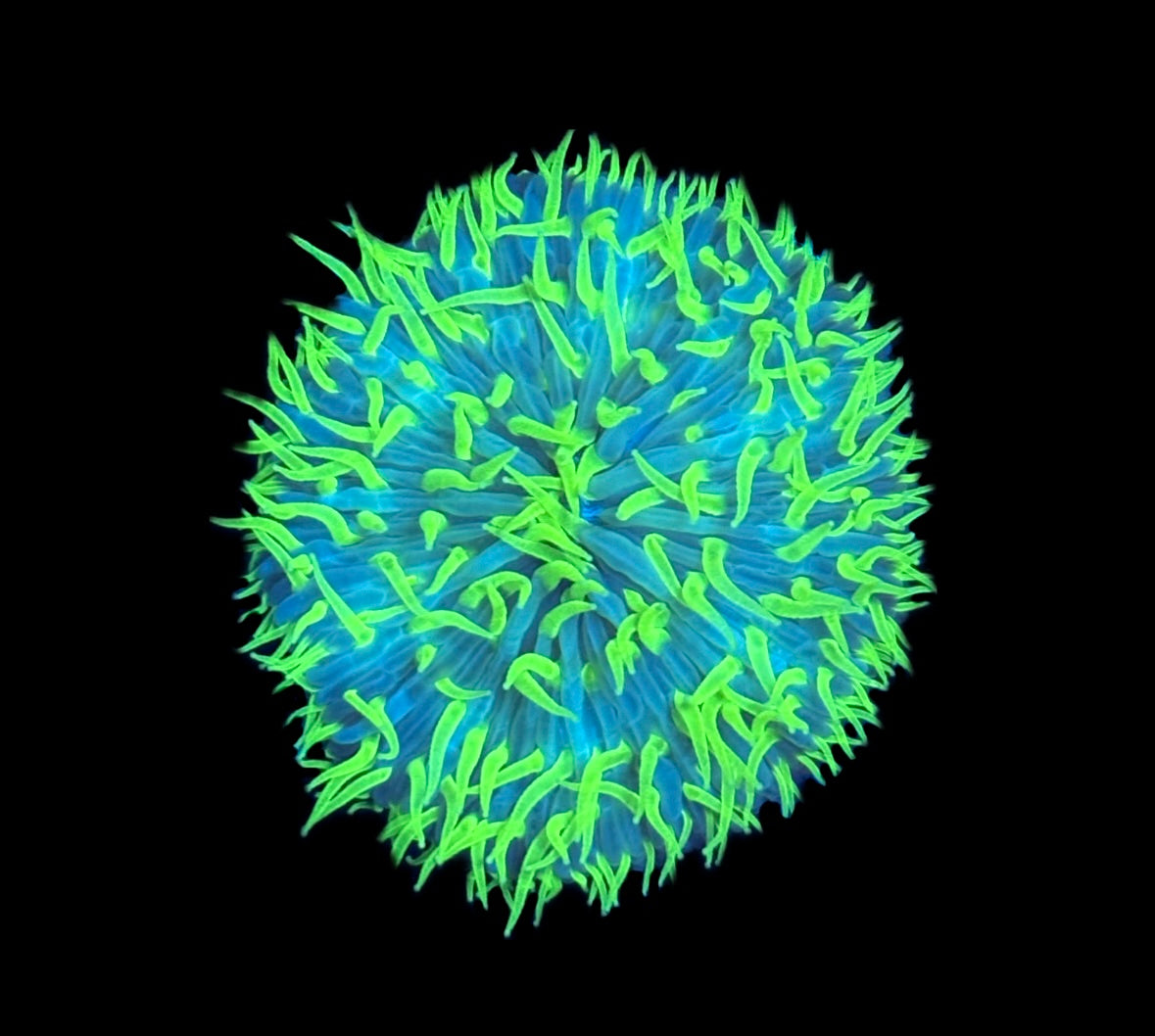 Amazing blue body with lighter blue streaks in the formation of a star and crazy bright neon green tentacles! Plate corals are best kept on the sand bed and will benefit from weekly feedings but is not required.