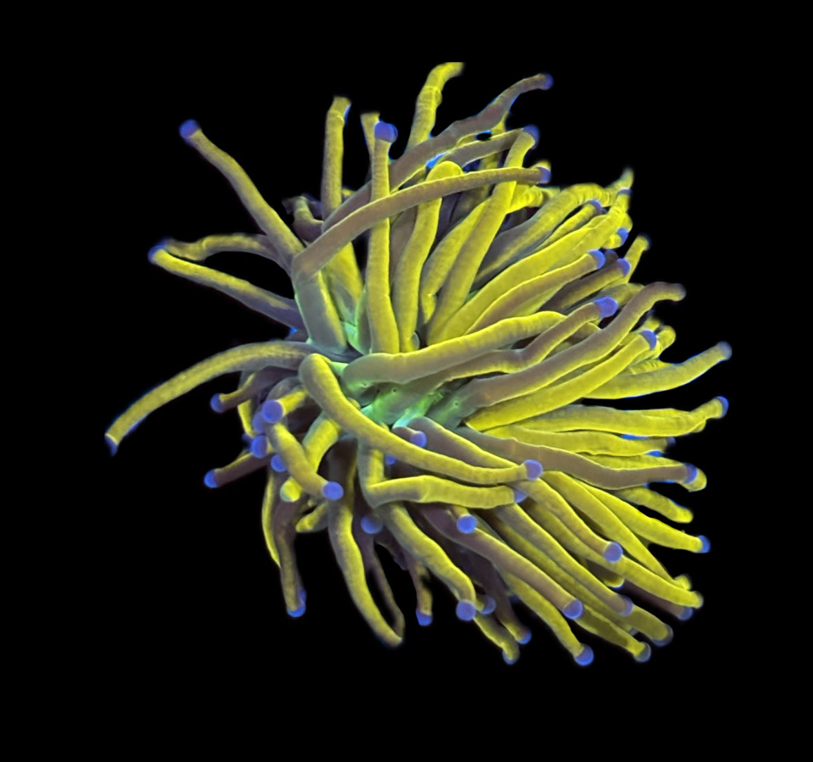 Not quote a knicks, not quite a tamer, but something else? This torch is absolutely wild in color with its pure gold/yellow long tentacles, deep purple tips and a perfect neon green base! WILD COLOR!