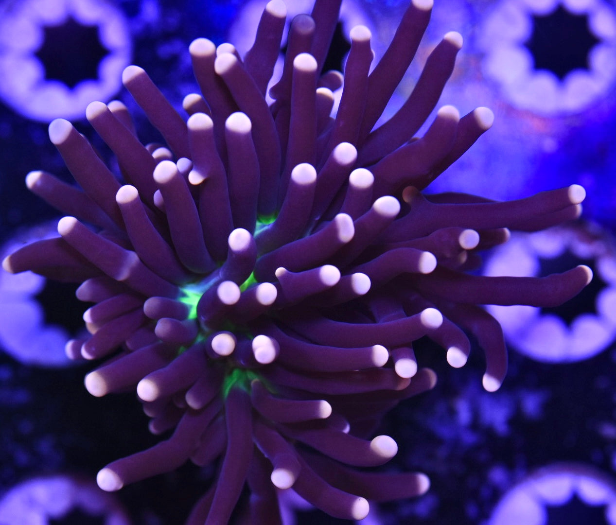 BRIGHT! With a beautiful neon green center and perfect purple stems this torch is one you "Gotta Have"!