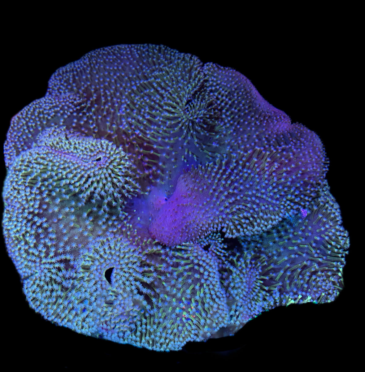 MASSIVE! Amazing Japanese Toadstool that is over 2' in length! Purple base with greenish tint and white polyps!! This Toadstool has been tank raised from a 4in colony for around 5-7 years!