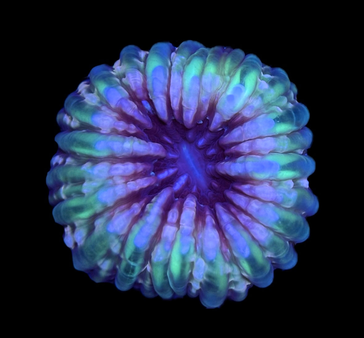 PUFFY! With a unique green rim, purple center, and hints of blue! This coral is best kept on the sanded and will benefit from weekly feedings but is not required.