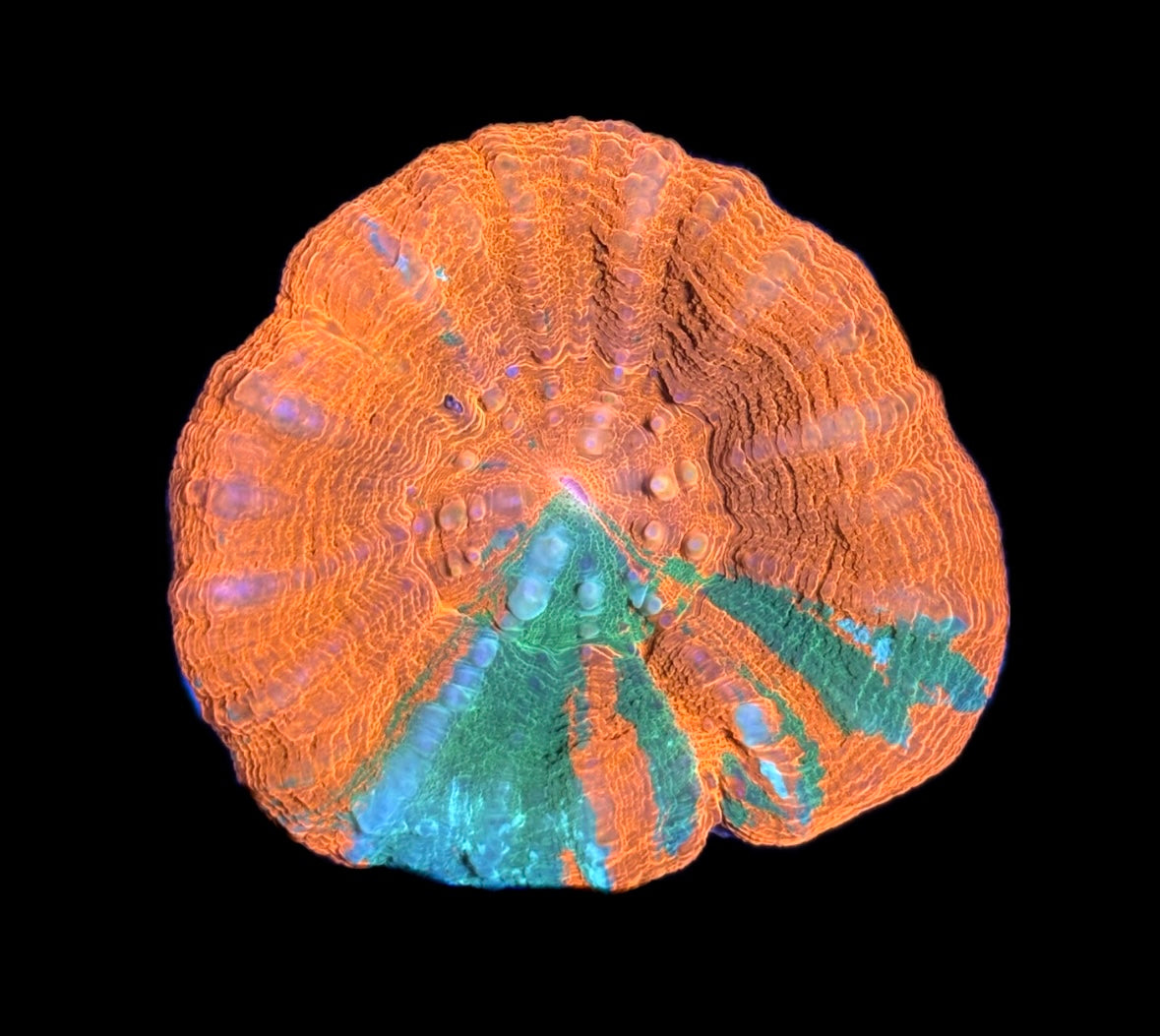 WOW! This scoly has perfect, bold colors with a mostly orange body and amazing green streaks! This coral will benefit from weekly feedings but is not required.