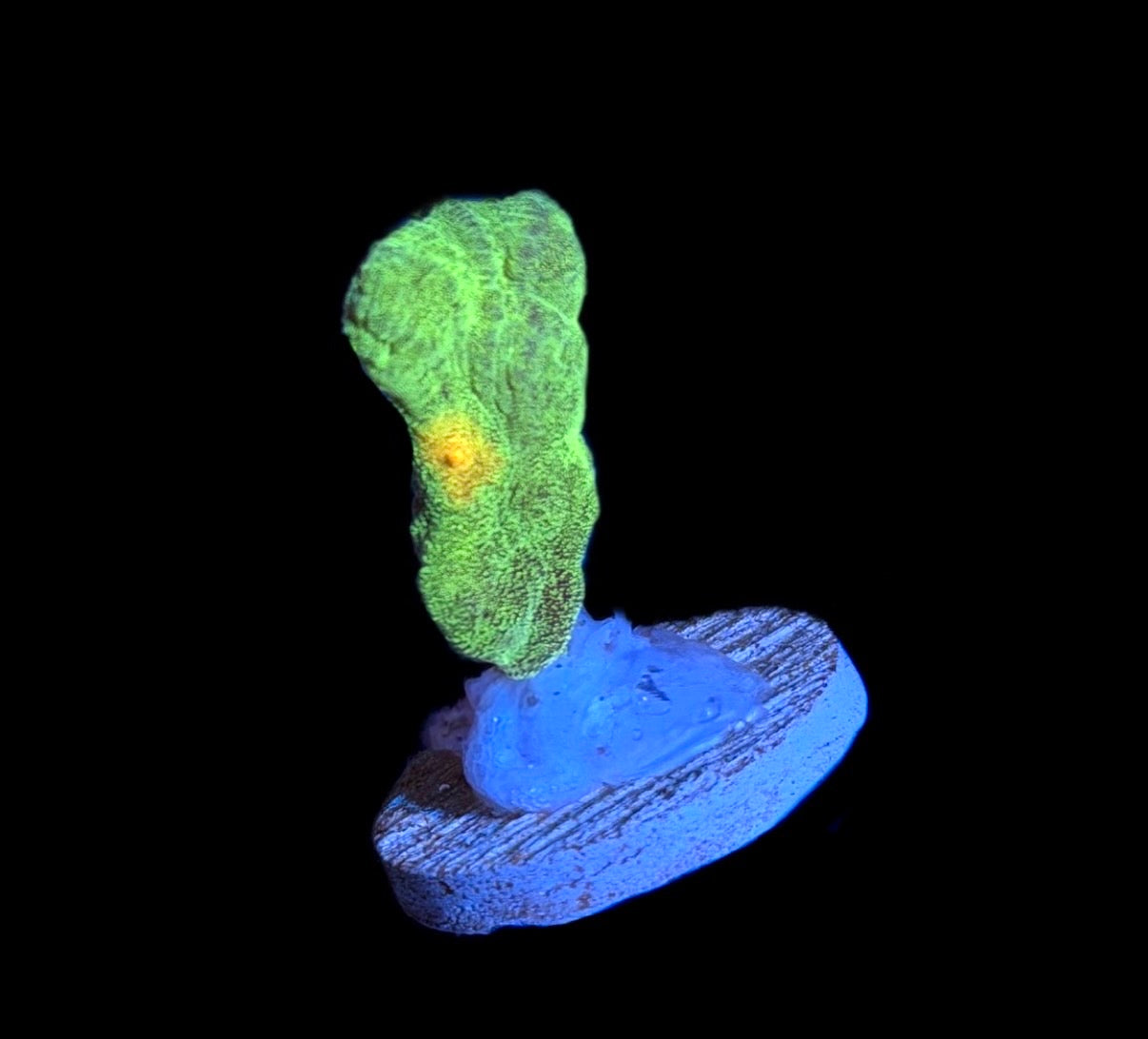 This iconic Pectinia is a must have in all reef tanks! Grown here at GHI Corals, this beautiful coral is very bright with a neon green body, yellow eyes, and orange/red accents.