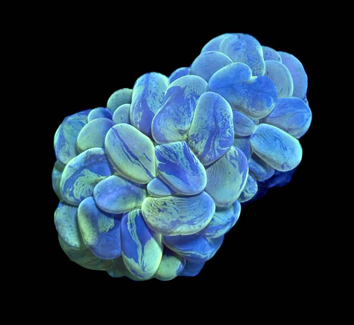 WOW! This bubble coral is not like the rest! Not only does it have very unique green and blue coloration but it also is the branching variant meaning this type of bubble can be fragged as it grows. Bubble coral will benefit from weekly feedings but is not required.