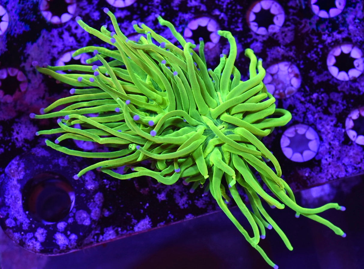 This iconic torch coral is bright and very healthy with a nice flesh band! Bright yellow/green coloration with blue/purple tips! Yellow coloration may fade in lower light while placing this coral in higher light will bring out more yellows!