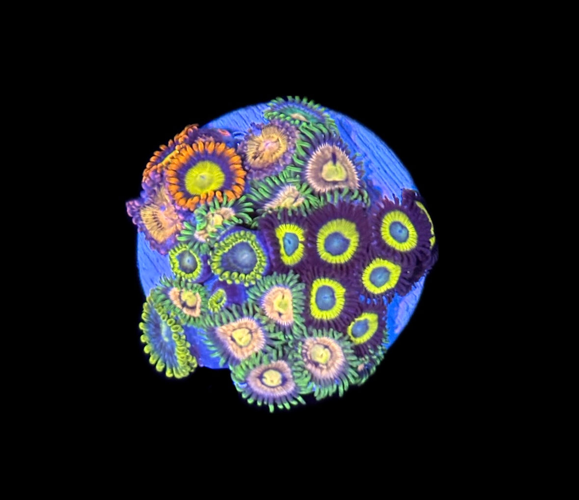 WYSIWYG GHI Corals Zoa Combo Frag with Golden Goddess Zoanthids, Smurfette Zoanthids, Black Bella Zoanthids, Mandarin Zoanthids, and Purple Monster Zoanthids approximately 25+ polyps